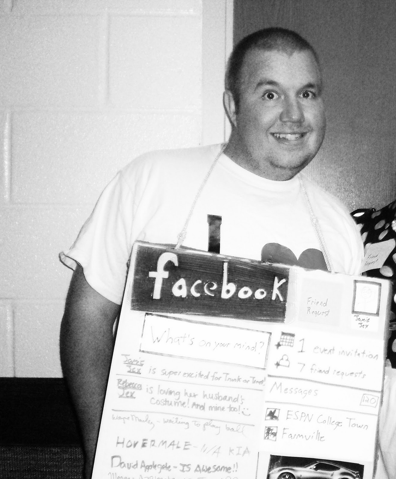 Halloween: Jamie as Facebook. He had a ton on fun with this costume because he'd walk around asking everybody to update their status. The people who got it, loved it. The people who didn't (most people) didn't really get it at all. He even put adds down the side of the pages. I love that man!